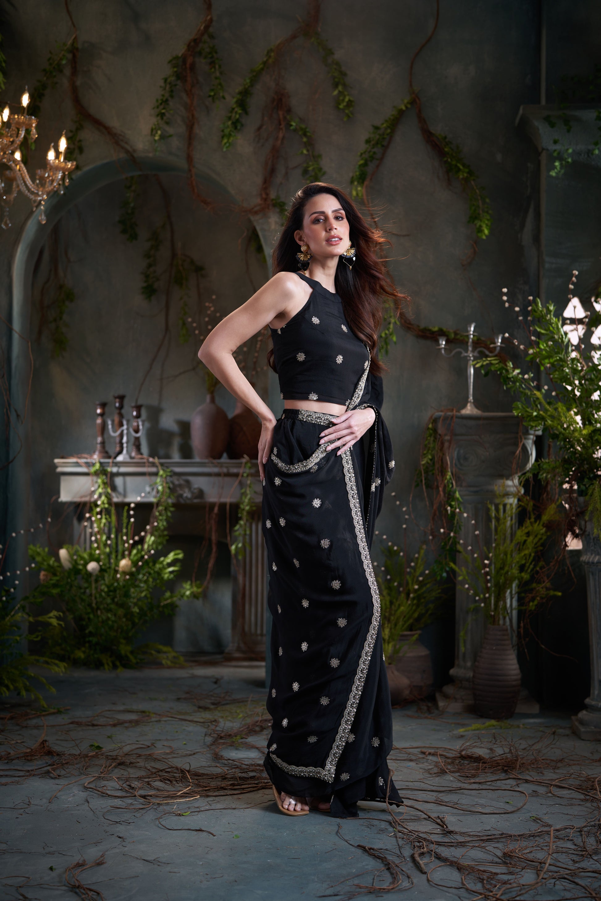 Black Chinon Pre-Draped Saree With Incut Blouse
